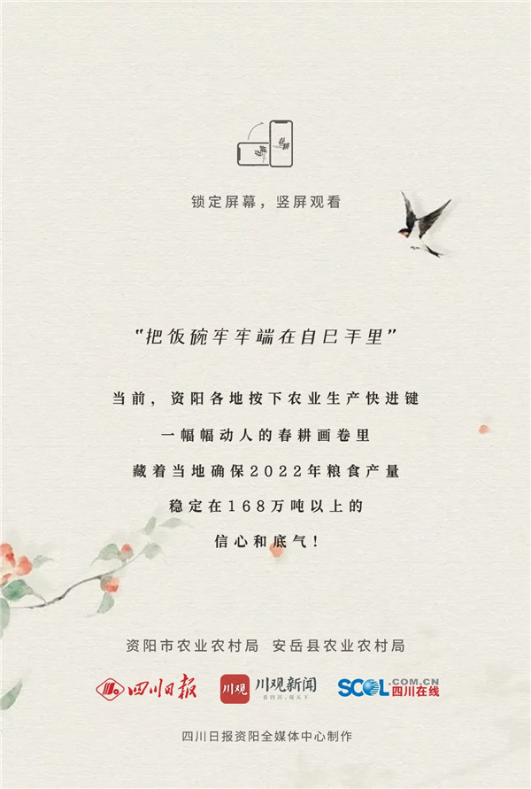 “把饭碗牢牢端在自己手里”。当前,资阳各地按下农业生产快进键,一幅幅动人的春耕花卷里,藏着当地确保2022年粮食产量稳定在168万吨以上的信心和底气!