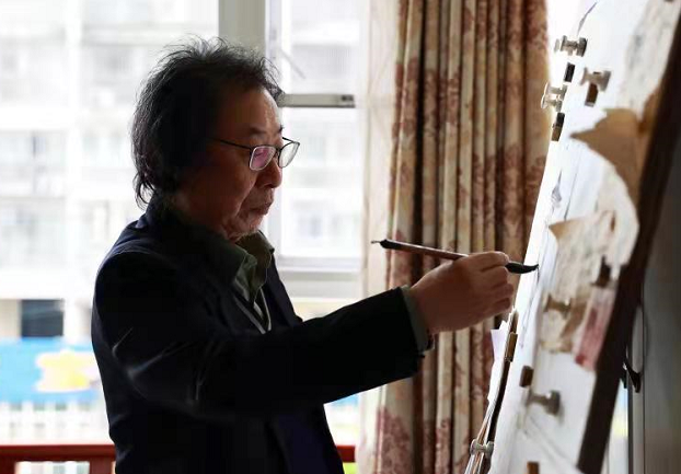 4月6日下午,内江威远籍漫画家黄渝文家中,一头自然卷中长发的黄渝文,手拿毛笔,蘸上水墨,在宣纸上开始勾画自己的漫画作品。