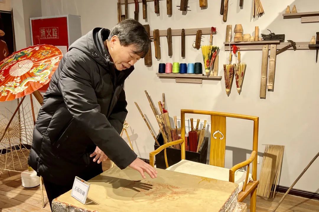 尽管已是六旬老翁,但一说到油纸伞,毕六福神采奕奕,精神抖擞。由于常年做伞,他的拇指和食指间,有几块做伞留下的刮痕,双手散发着桐油味。