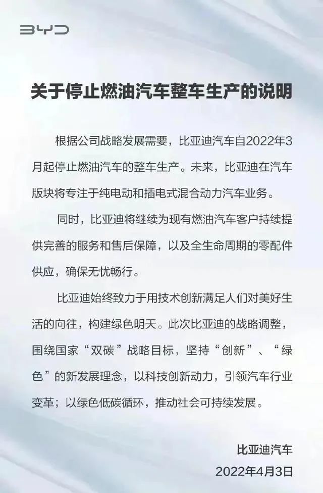 4月3日,比亚迪汽车正式宣布,根据其战略发展需要,自2022年3月起停止燃油汽车的整车生产。未来,比亚迪将专注于纯电动和插电式混合动力汽车业务。
