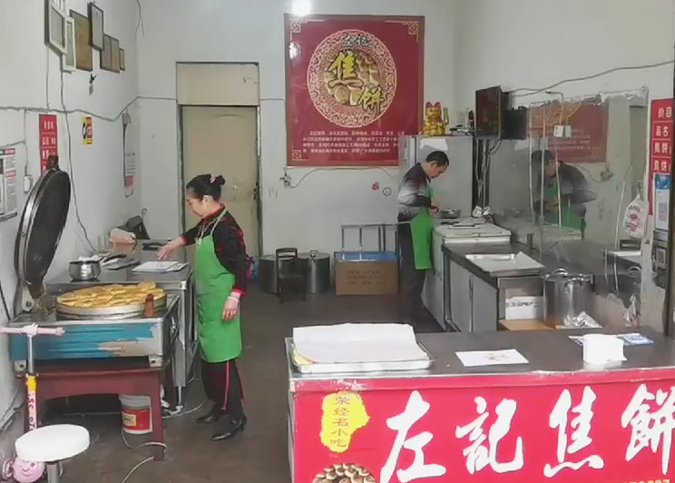 “老板,帮我装一个焦饼。”正值早餐时间,左记焦饼店的老板左新建和妻子开始忙碌起来。