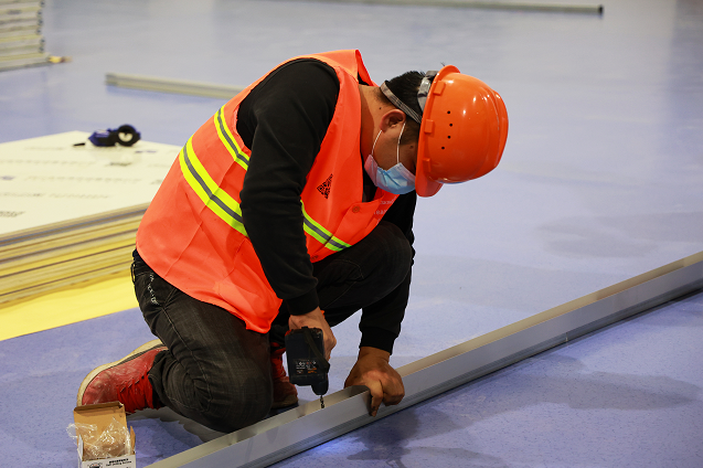 目前,内江市级方舱医院建设已完成原有地板保护膜、PVC地板层的,舱区搭建已完成30%。