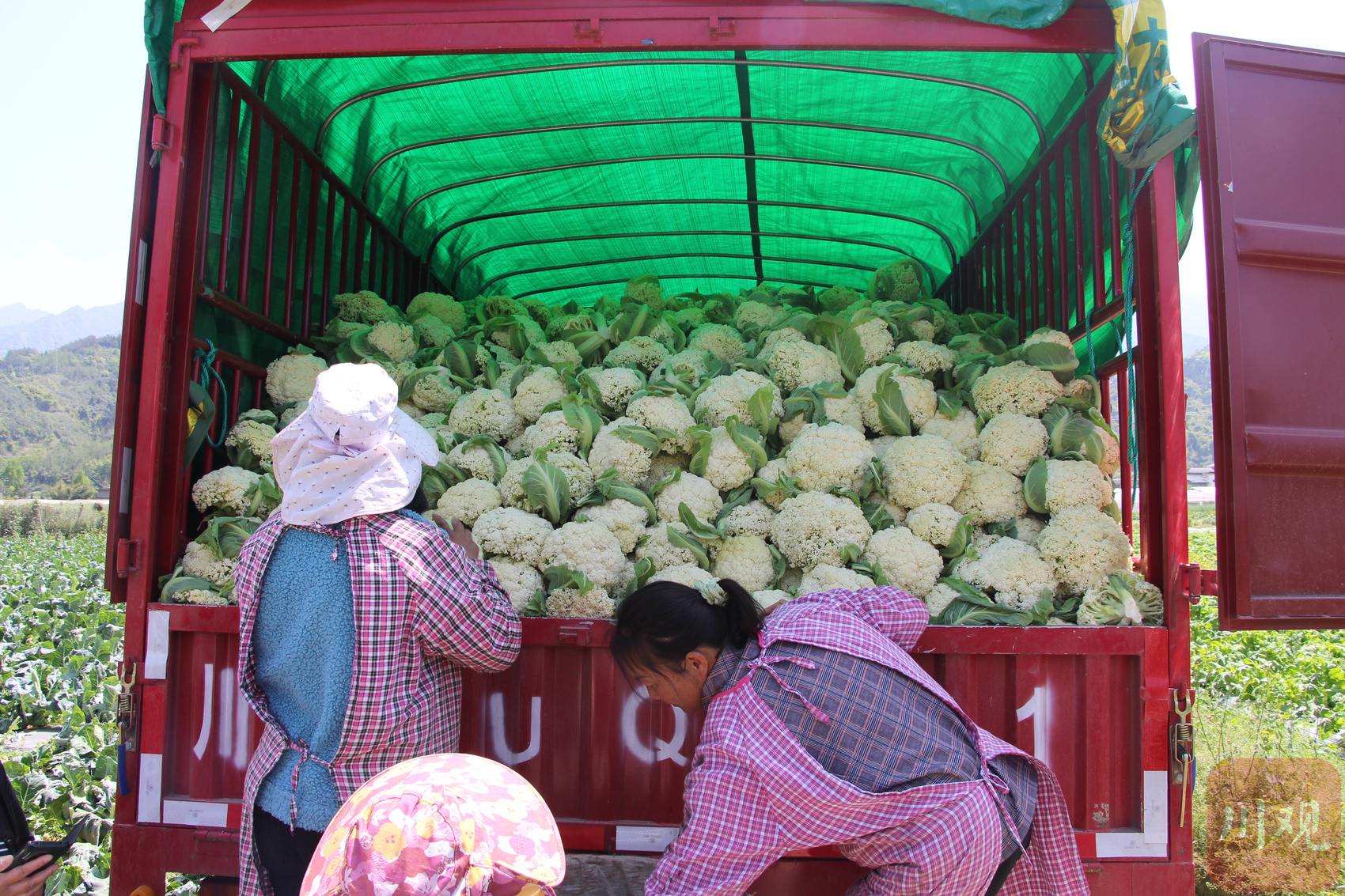 在隆兴村开心农场,村民正在把花菜装车