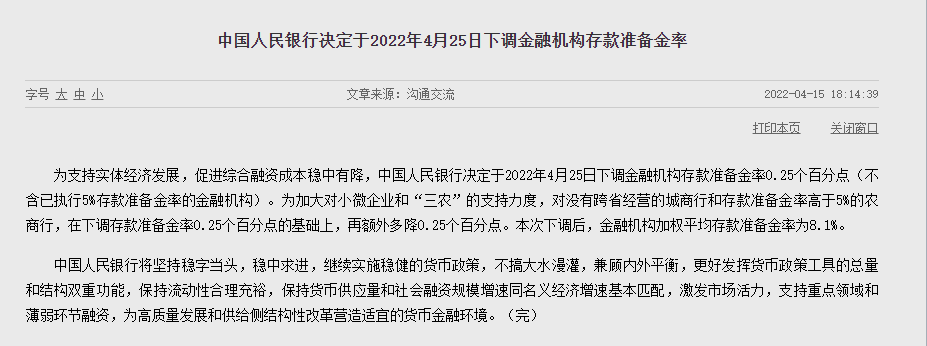 4月15日晚间,中国人民银行决定于2022年4月25日下调金融机构存款准备金率0.25个百分点(不含已执行5%存款准备金率的金融机构)。为加大对小微企业和“三农”的支持力度,对没有跨省经营的城商行和存款准备金率高于5%的农商行,在下调存款准备金率0.25个百分点的基础上,再额外多降0.25个百分点。本次下调后,金融机构加权平均存款准备金率为8.1%。