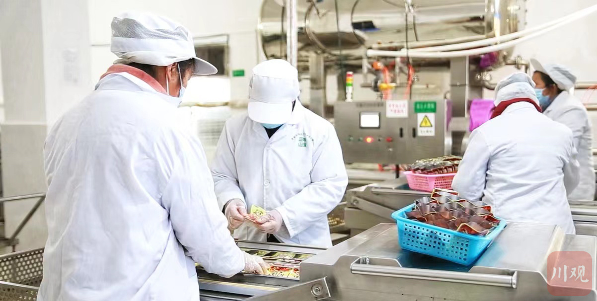下午,川观新闻记者来到古蔺县彰德街道光辉村,还没跨进三深农产品公司加工厂大门,就闻到了空气中弥漫着的卤香与肉香。加工车间内,新鲜卤制的麻辣鸡出锅后,被摆放到包装车间案板上,稍微冷却后,工作人员利索地将加工好的麻辣鸡装进小袋。