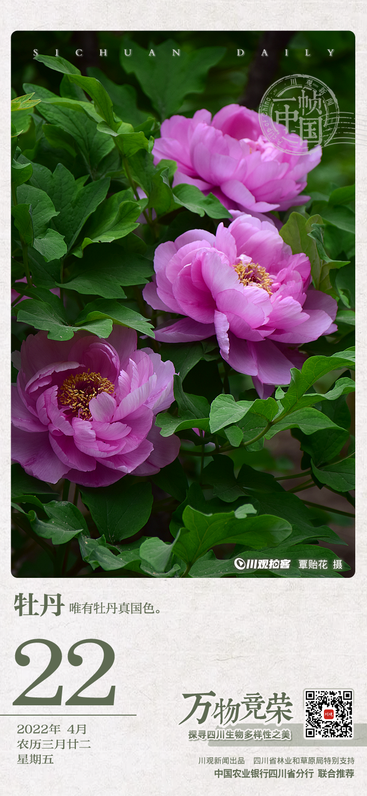 “云想衣裳花想容,春风拂槛露华浓。若非群玉山头见,会向瑶台月下逢。”四川牡丹的栽培也始于唐代,到宋时已广泛栽培。据宋代胡元质《牡丹谱》记载,“蜀中自李唐后,未有此花。凡图绘者,惟名洛阳花。至伪蜀孟氏,于宣华苑中,广加栽植,名之曰‘牡丹苑’。”诗人陆游曾经写下《天彭牡丹谱》,称“牡丹,在中州,洛阳为第一。在蜀,天彭为第一。”四川牡丹栽培主要分布在成都、彭州(古称天彭)、峨眉山等地,尤以彭州为盛。彭州丹景山更是蜀中赏牡丹胜地。
