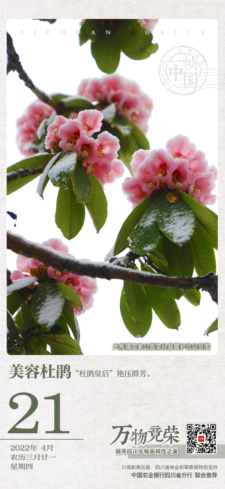 不过,四川的众多杜鹃花中最有特色的,要算命名标本采自雅安宝兴的“美容杜鹃”。它以其叶之大、花之繁赢得了“杜鹃皇后”“美人红”名号。