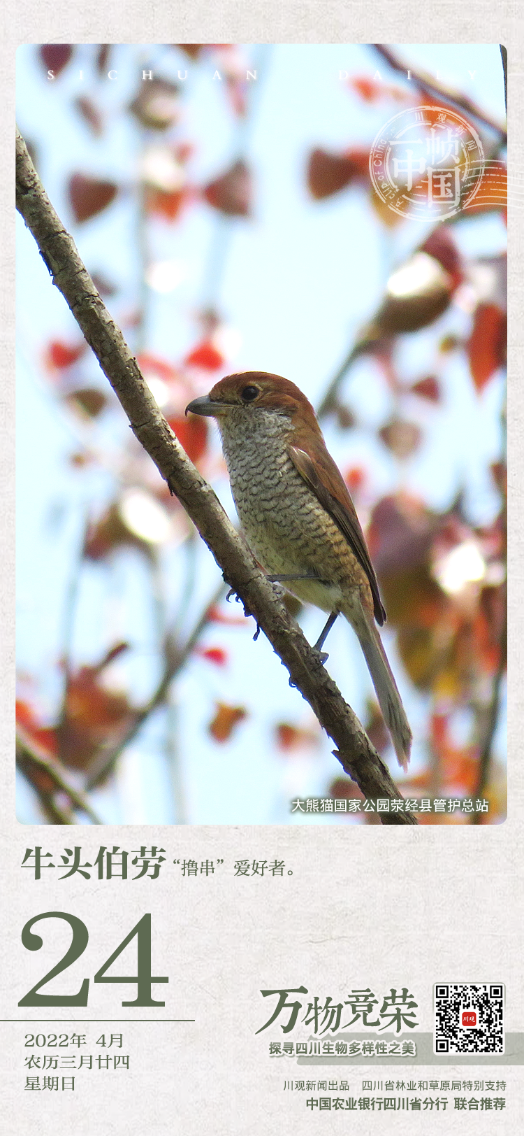 喙粗短强健的牛头伯劳,酷爱“撸串”。捕猎时,它们拖着长长的尾巴,或立于树梢间,或站于木桩上,伺机捕食小昆虫。如果捉到了一下子吞不进去的猎物,它们就会将其悬挂在树枝、尖刺或铁丝上,然后撕扯蚕食。这种捕食技能,让它成为雀类中的霸王,甚至有了“雀中之虎”的称呼。
