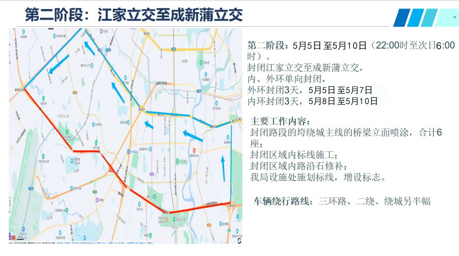 二、2022年5月5日至5月7日的每日22:00至次日6:00,成都绕城高速(G4202)成新蒲立交至江家立交的高速路段外环封闭施工,禁止机动车通行;2022年5月8日至5月10日的每日22:00至次日6:00,成都绕城高速(G4202)江家立交至成新蒲立交的高速路段内环封闭施工,禁止机动车通行。在此期间,蓉遵高速(G4215)、天府收费站、锦城湖收费站、京昆高速(G5)成雅高速段、白家收费站、成都机场收费站、接待寺立交双流收费站、成新蒲立交通往绕城高速施工路段的匝道同步封闭。