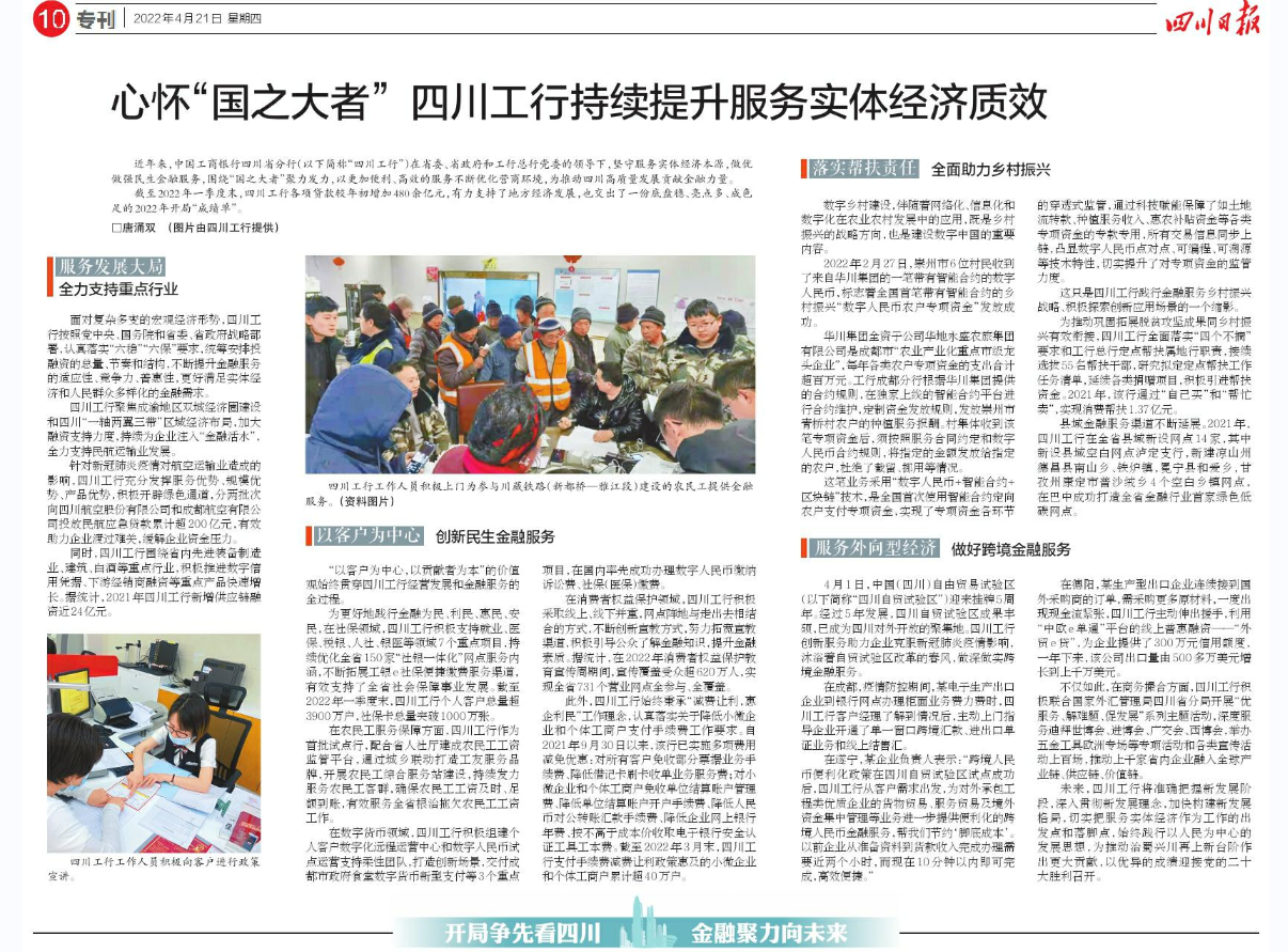 近年来,中国工商银行四川省分行(以下简称“四川工行”)在省委、省政府和工行总行党委的领导下,坚守服务实体经济本源,做优做强民生金融服务,围绕“国之大者”聚力发力,以更加便利、高效的服务不断优化营商环境,为推动四川高质量发展贡献金融力量。