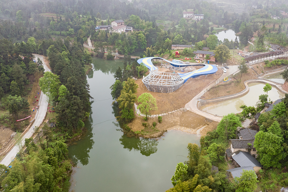 4月20日,威远县连界镇穹窿植物园建设现场,工人正在进行栽培花卉苗木,园区道路等配套已基本完善。在植物园中央,一栋造型独特的环形钢结构建筑已完成主体施工。“这栋建筑我们称为‘穹窿之眼’,未来将用作收集、保育蕨类珍稀植物,开展植物科普、研学活动等。”穹窿植物园植物园规划师刘章池说道。
