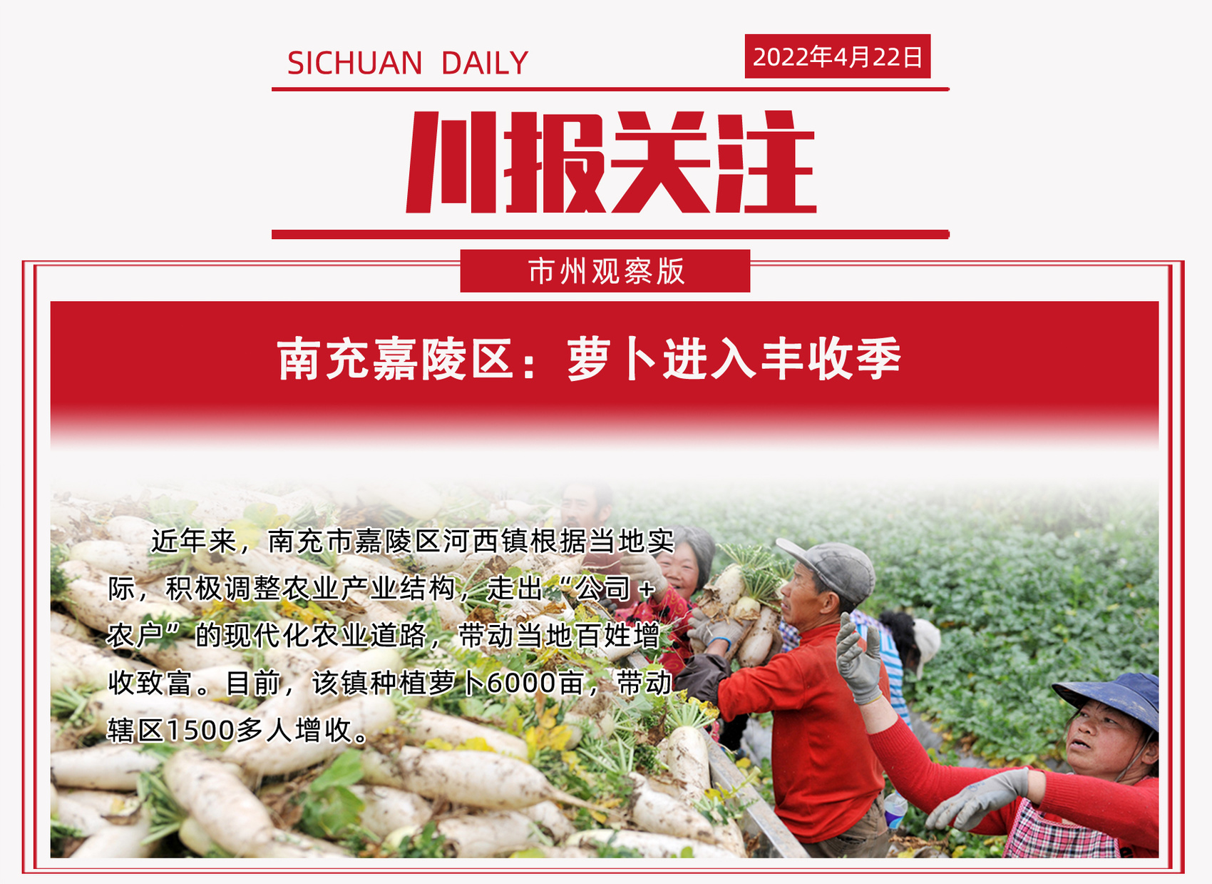 近年来,南充市嘉陵区河西镇根据当地实际,积极调整农业产业结构,走出“公司+农户”的现代化农业道路,带动当地百姓增收致富。目前,该镇种植萝卜6000亩,带动辖区1500多人增收。图为4月16日,河西镇泰山村万亩蔬菜产业基地,村民正忙着将丰收的萝卜装车。 余中华 摄