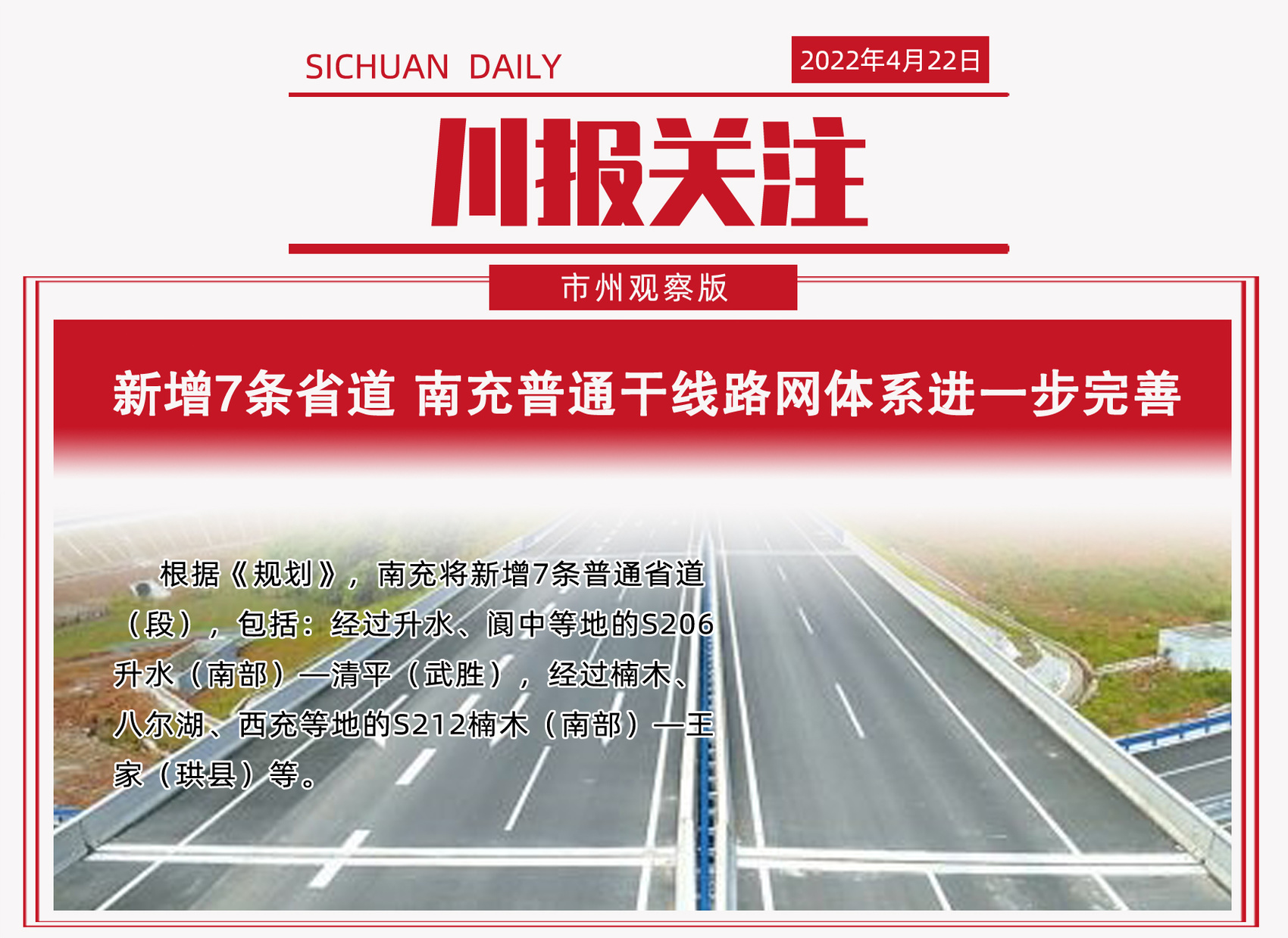据近日省交通运输厅、省发展改革委联合印发的《四川省普通省道网布局规划(2022—2035年)》(以下简称《规划》),南充市将新增7条省道(含1条原有S206延长线),全市普通干线路网体系将进一步完善。