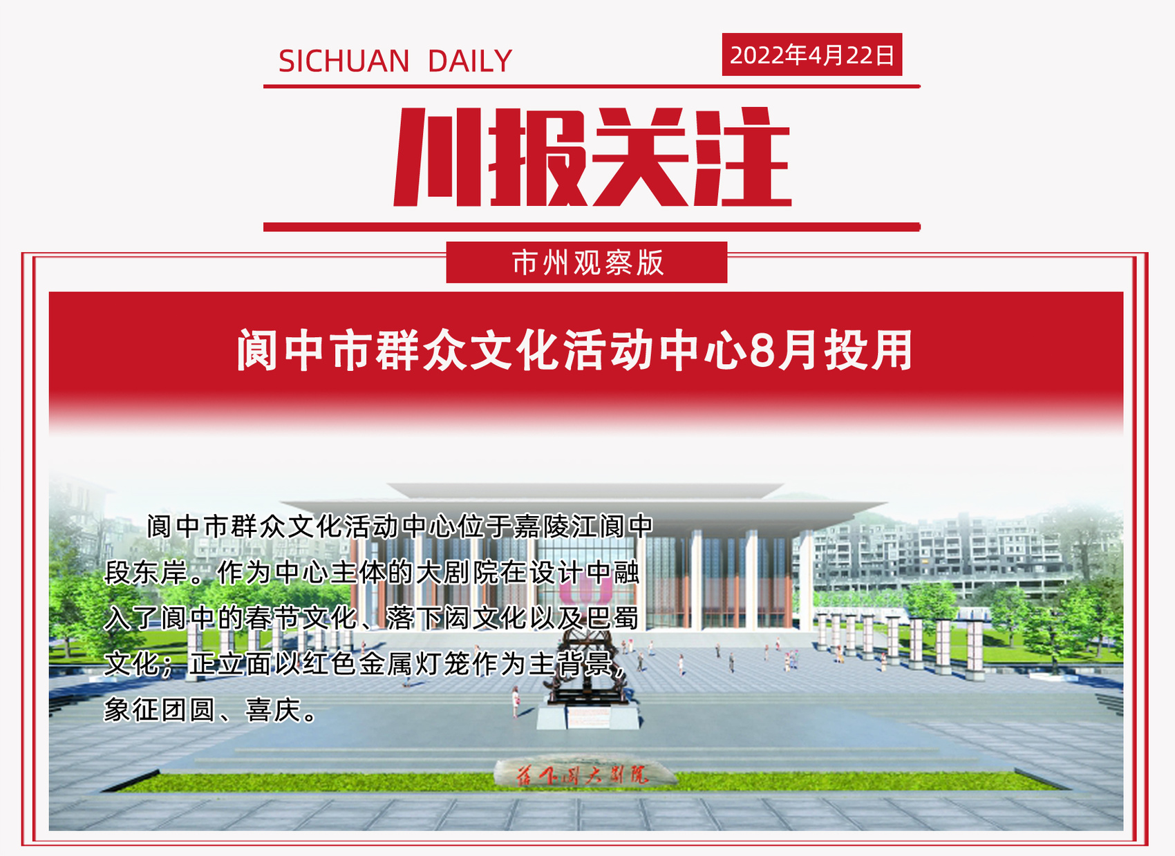 阆中市群众文化活动中心位于嘉陵江阆中段东岸。作为中心主体的大剧院在设计中融入了阆中的春节文化、落下闳文化以及巴蜀文化;正立面以红色金属灯笼作为主背景,象征团圆、喜庆;两侧墙面点缀的浮雕也以二十四节气、春节文化元素为主题。