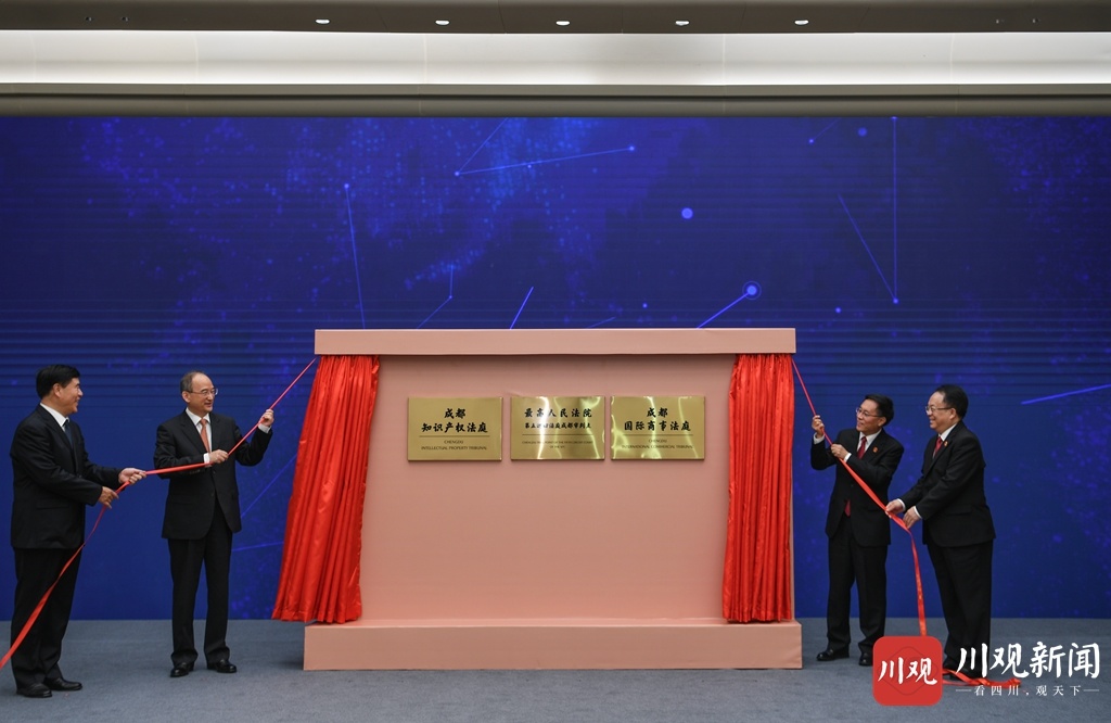 10时20分许,黄强、高憬宏、邓勇、省法院院长王树江共同为“最高人民法院第五巡回法庭成都审判点”“成都国际商事法庭”“成都知识产权法庭”揭牌。