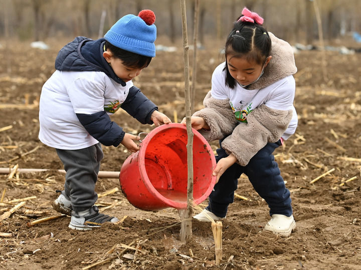 3月12日,在北京第五季龙水凤港生态农场,小朋友在公益植树活动上为树苗浇水。新华社记者 李贺 摄