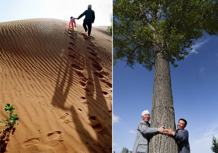这是一张拼版照片,左图为:1998年8月,榆林市靖边县郭成旺老人带着曾孙行进在沙漠中。老人希望子子孙孙植树造林,直到沙漠都变成绿洲;右图为:2020年5月22日,99岁的郭成旺老人(左)与孙儿郭建军抱着当年栽下的第一棵杨树,向参观者介绍当年植树的情景。1984年,郭成旺承包了离家10公里处的荒沙地,带领全家常年吃住在沙地的简易房里,为4.5万亩沙漠披上了绿装。新华社记者 陶明 摄