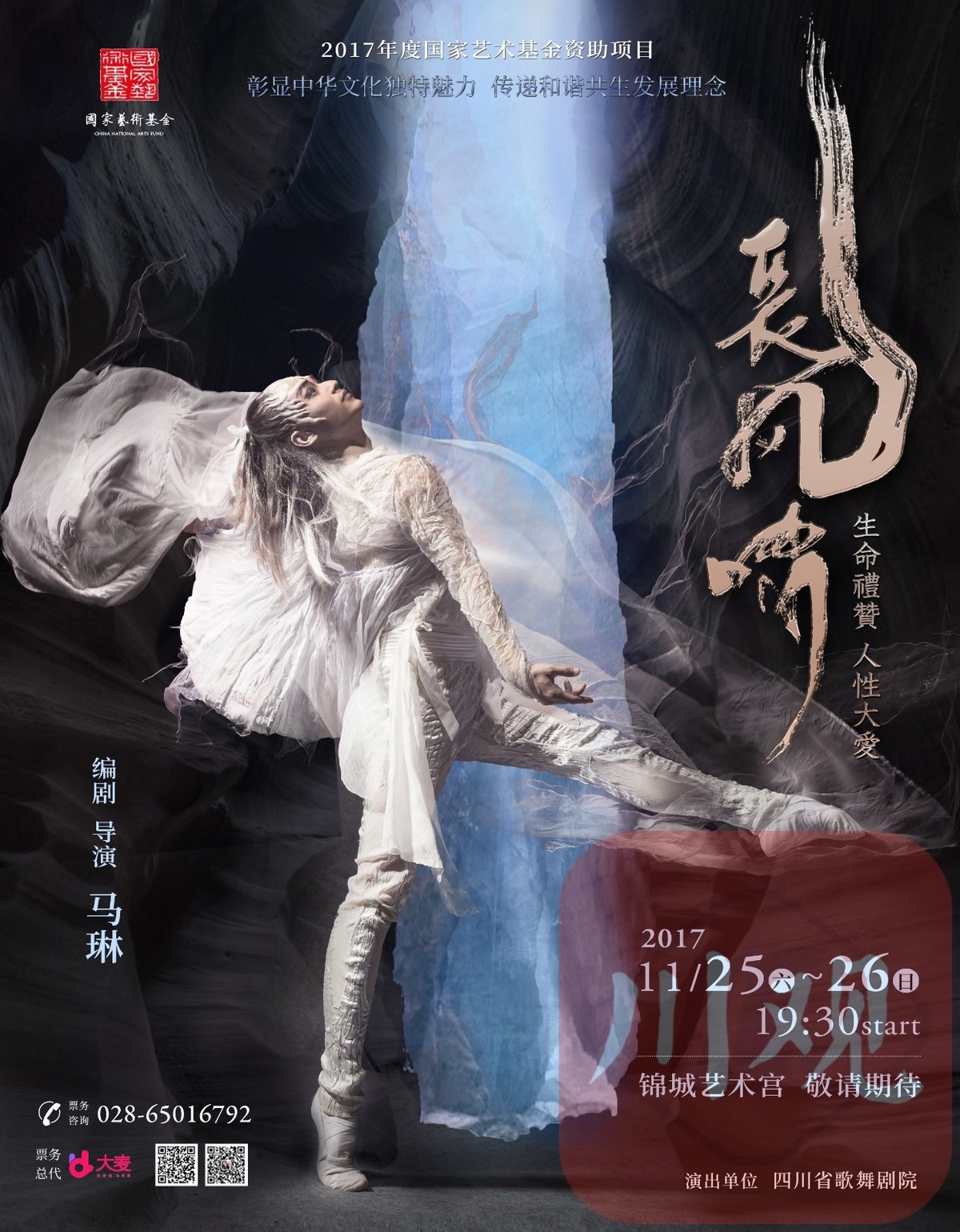 由四川省歌舞剧院出品,也是2017年国家艺术基金的支持项目。它讲述一位以“风”为原型的神灵,因捕获了女娲补天时散落的一颗五彩石,拥有了一颗神奇跳动的心脏——灵心,随后化身少年,在人间历经爱恨生死的奇遇故事。其间融合西方极简主义与东方绘画的写意风格,力图兼顾厚重的历史感和轻盈空灵的东方特色。
