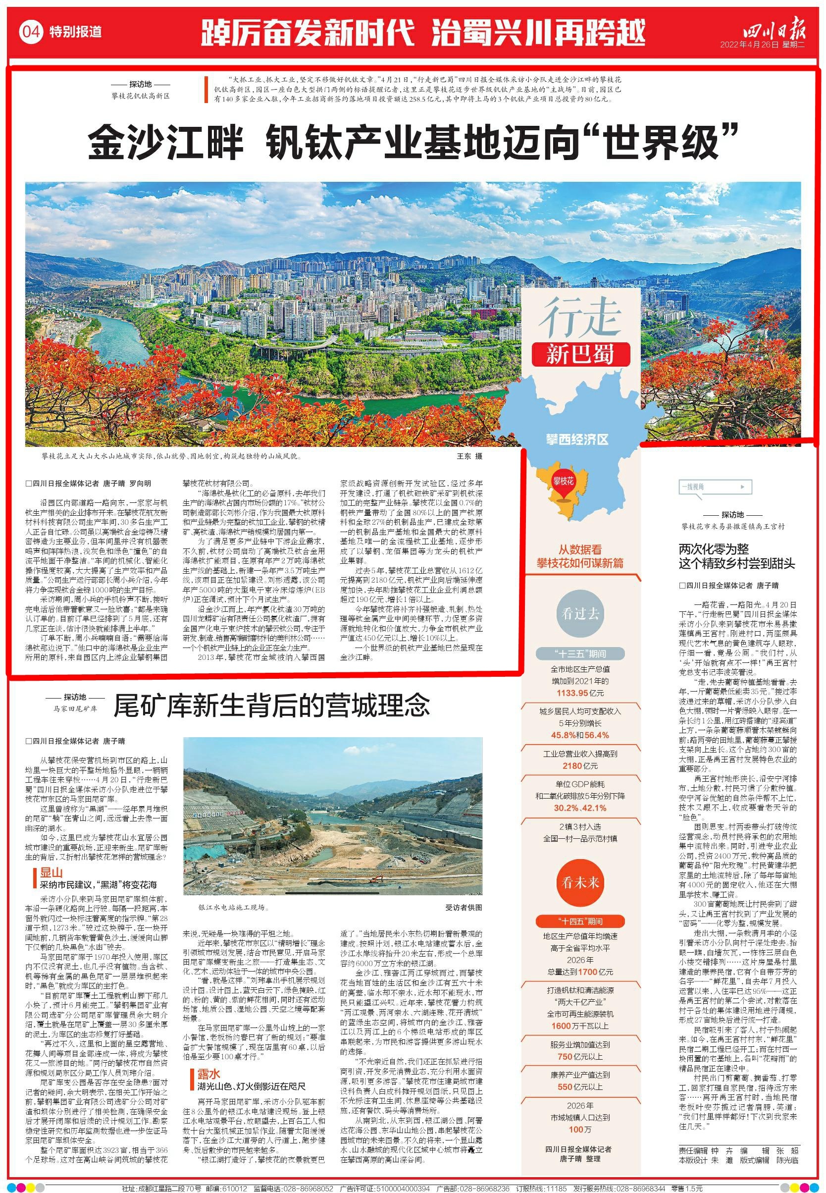 “大抓工业、抓大工业,坚定不移做好钒钛文章。”4月21日,“行走新巴蜀”四川日报全媒体采访小分队走进金沙江畔的攀枝花钒钛高新区,园区一座白色大型拱门两侧的标语提醒记者,这里正是攀枝花迈步世界级钒钛产业基地的“主战场”。目前,园区已有140多家企业入驻,今年工业招商新签约落地项目投资额达258.5亿元,其中即将上马的3个钒钛产业项目总投资约80亿元。