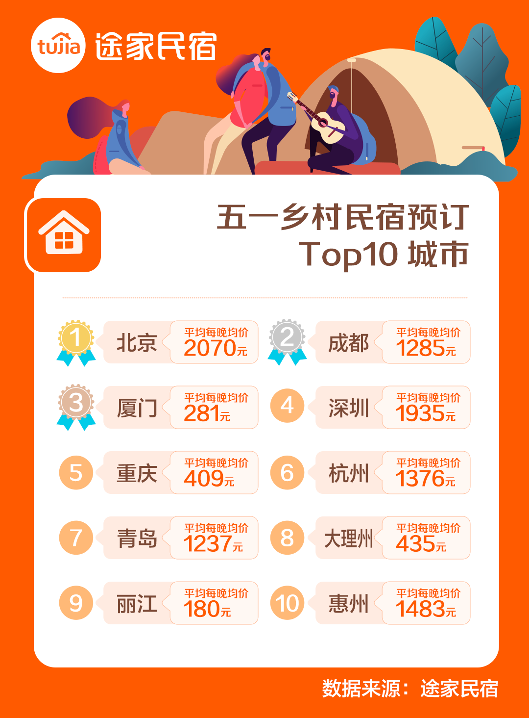 五一乡村民宿预定TOP10城市。(来源:途家)