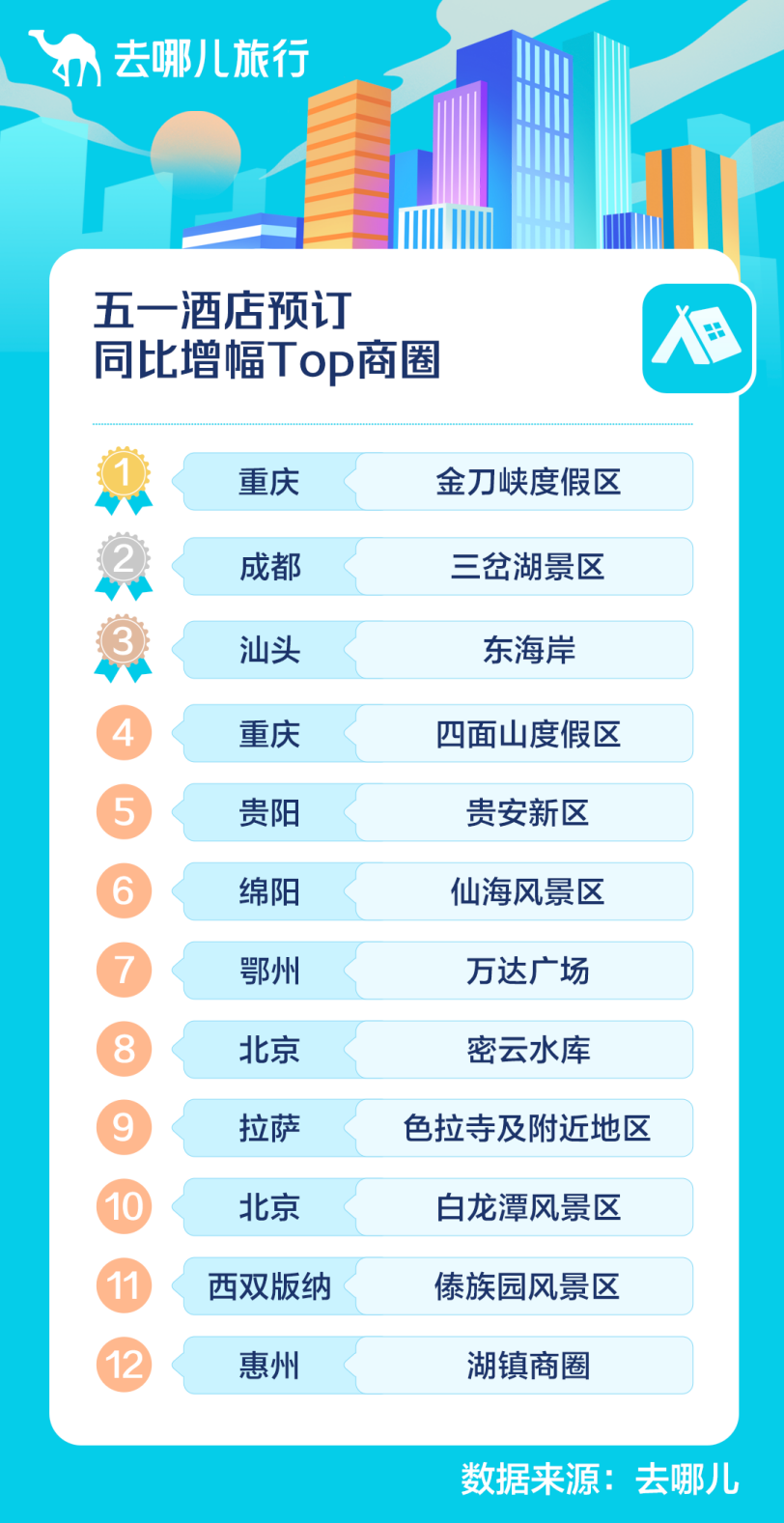 五一酒店预定同比增幅TOP商圈。(来源:去哪儿)