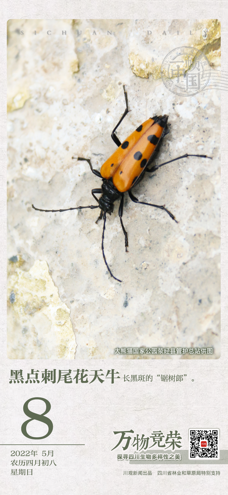 天牛作为一种甲壳虫,有长长的触须,背部还有异彩纷呈美丽的花纹,触须显得纤细,一节一节地向上长着。它们在树干钻孔打洞,甚而在土中取食根部。黑点刺尾花天牛,是花天牛亚科中的一种,体黑色,鞘翅黄褐色有黑斑点,黑色部分被灰色细短毛,黄褐部分被黄色细短毛。
