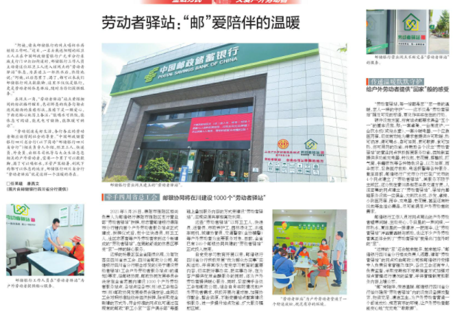 “劳动创造美好生活,各行各业的劳动者都应该得到社会的尊重。”中国邮政储蓄银行四川省分行(以下简称“邮储银行四川省分行”)相关负责人介绍,环卫工人、快递员、外卖员、出租车司机等与大众生活息息相关的户外劳动者,需要一个累了可以歇歇脚、渴了可以喝杯水,不管严寒酷暑、刮风下雨都可以休息的地方,邮储银行四川省分行“劳动者驿站”就是这样一个温暖的存在。