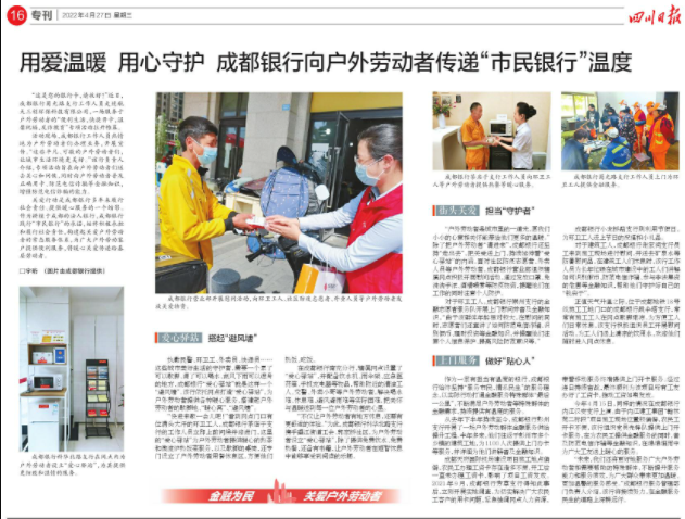 关爱行动是成都银行多年来履行社会责任、提供暖心服务的一个缩影。作为耕植于成都的法人银行,成都银行践行“市民银行”的承诺,始终积极承担和履行社会责任,构建起关爱户外劳动者的常态服务体系,为广大户外劳动客户提供便利服务,将暖心关爱传递给基层劳动者。