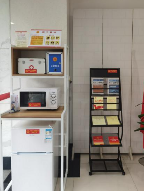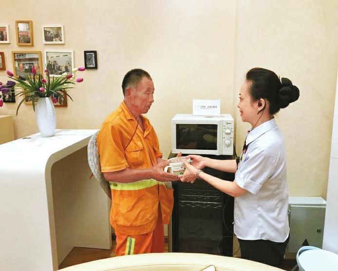 “快进来歇一会儿吧!”看到网点门口有位满头大汗的环卫工人,成都银行茶店子支行的工作人员立即上前问候并迎进门,这里的“爱心驿站”为户外劳动者提供暖心的热茶和微波炉热饭菜服务,以及歇脚的桌椅,还专门设立了户外劳动者用餐休息区,方便他们热饭、吃饭。
