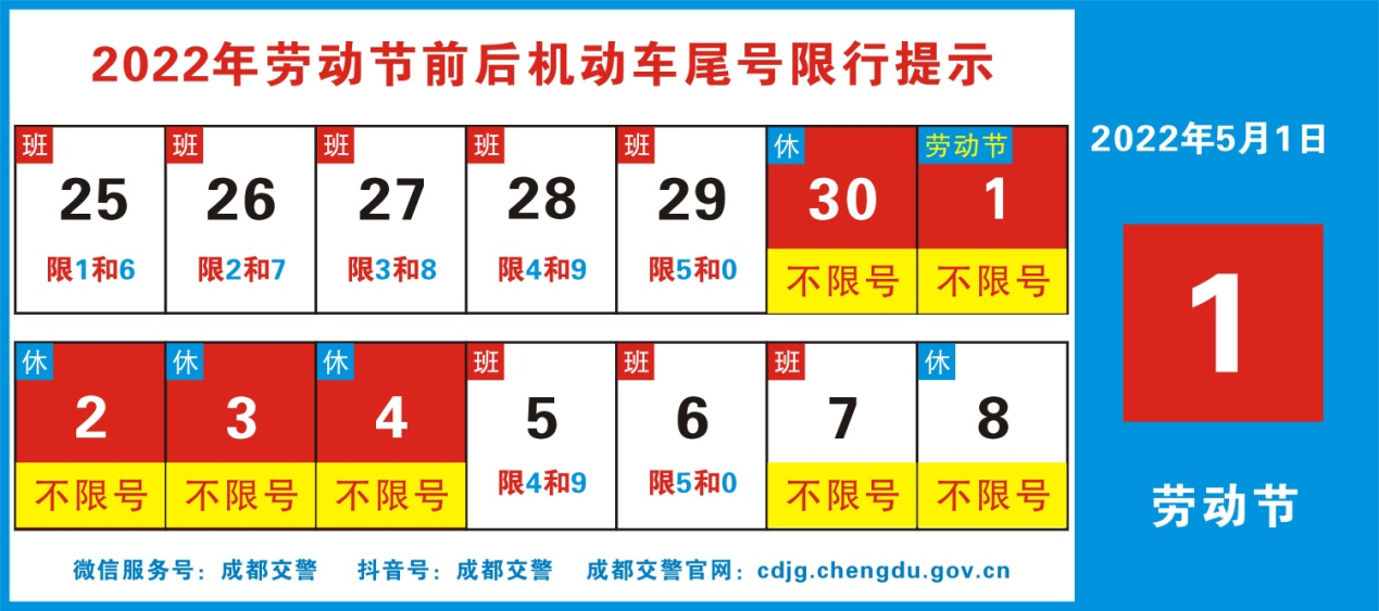 4月28日,记者从成都市交管局获悉,随着2022年“五一”假期(4月30日-5月4日)即将来临,该局发布2022年“五一”劳动节前后机动车尾号限行提示。根据提示,4月30日-5月4日“五一”假期实施不限号措施;5月7日,虽然是工作日,但是由于是周末,依旧实施不限号措施。