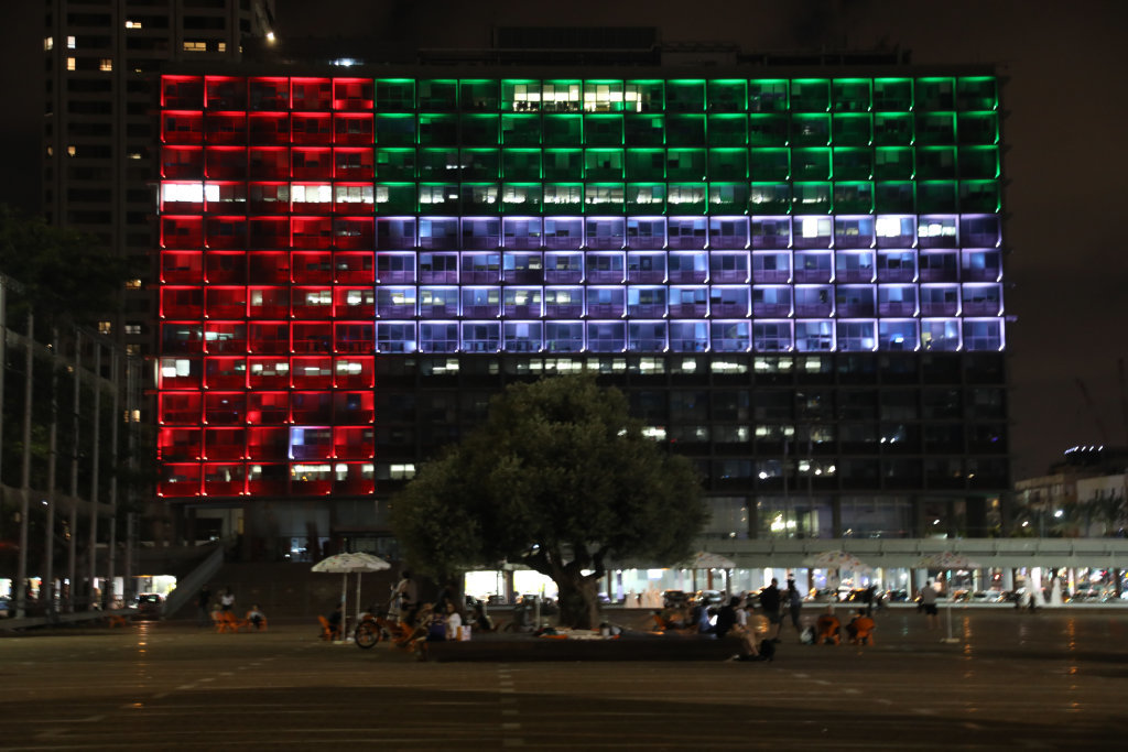 8月13日,以色列中部城市特拉维夫的市政大楼点亮阿联酋的国旗颜色。图据新华社