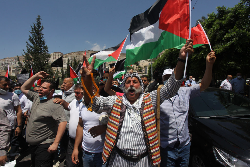 8月14日,巴勒斯坦人在约旦河西岸城市纳布卢斯抗议以色列与阿联酋达成的和平协议。图据新华社发(尼达勒 摄)