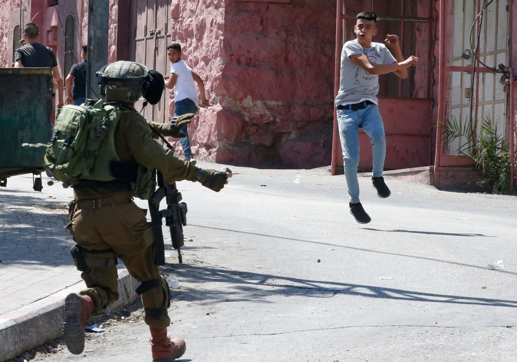 8月14日,在约旦河西岸城市希伯伦,一名巴勒斯坦示威者向以色列士兵投掷石块。图据新华社