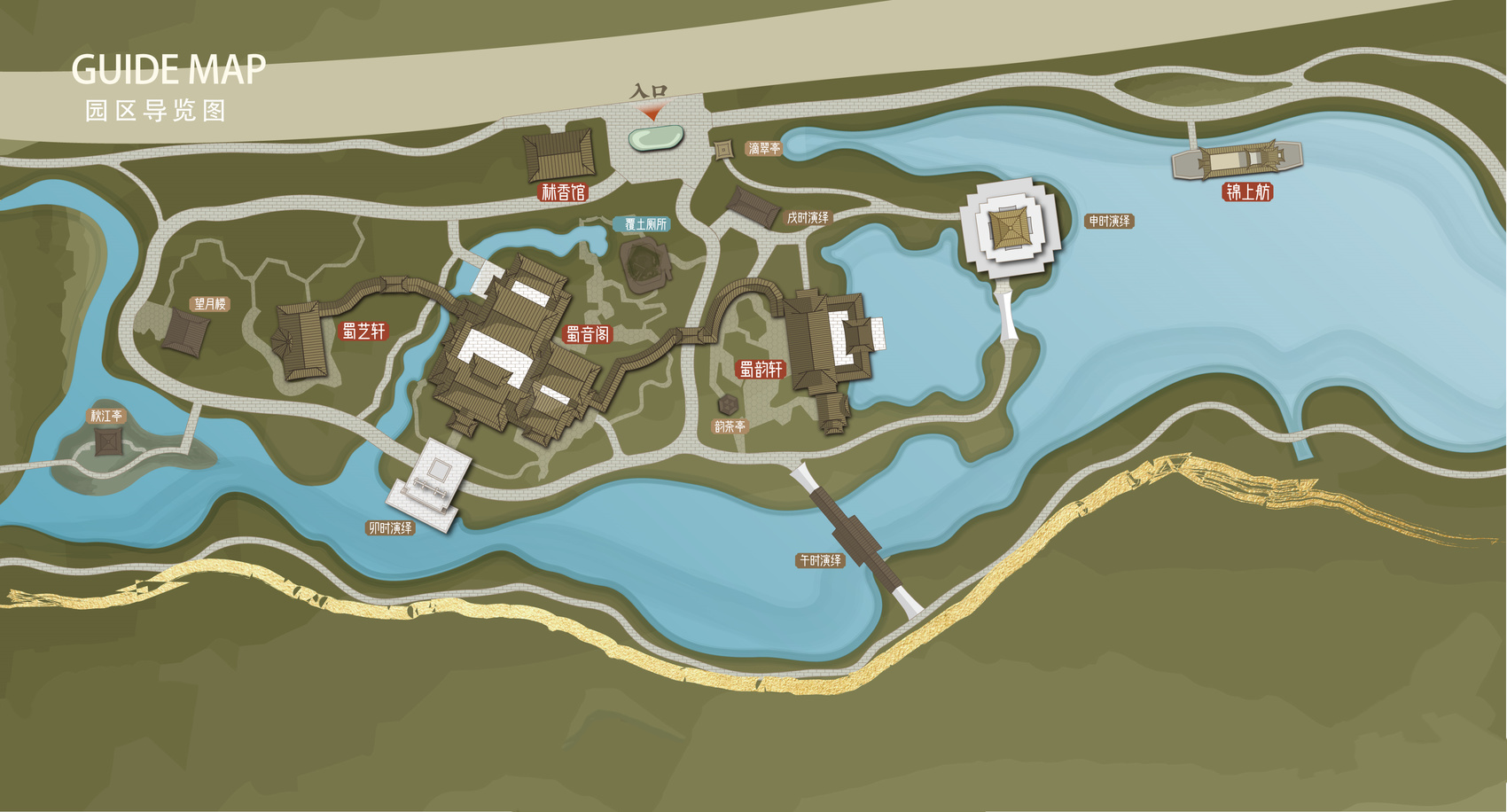 蜀园项目负责人张勇介绍,整个园区位于金牛宾馆北侧,紧邻金蕊路、华严路区域,占地面积约 110 亩,其中水域面积约33亩,园林景观面积约77亩,大致以荷华湖—“川西园林缩影”的规划布局为基础,与川西传统古建筑风格一脉相承,又充分结合了川剧文化特色,将古建筑历史风格元素和现代装饰设计手法融合,从样式、色彩、图案等多角度、多维度、多层次全视觉呈现,呈现出雅致、简约、明快的风格,力求实现“犹如画中游”的效果。