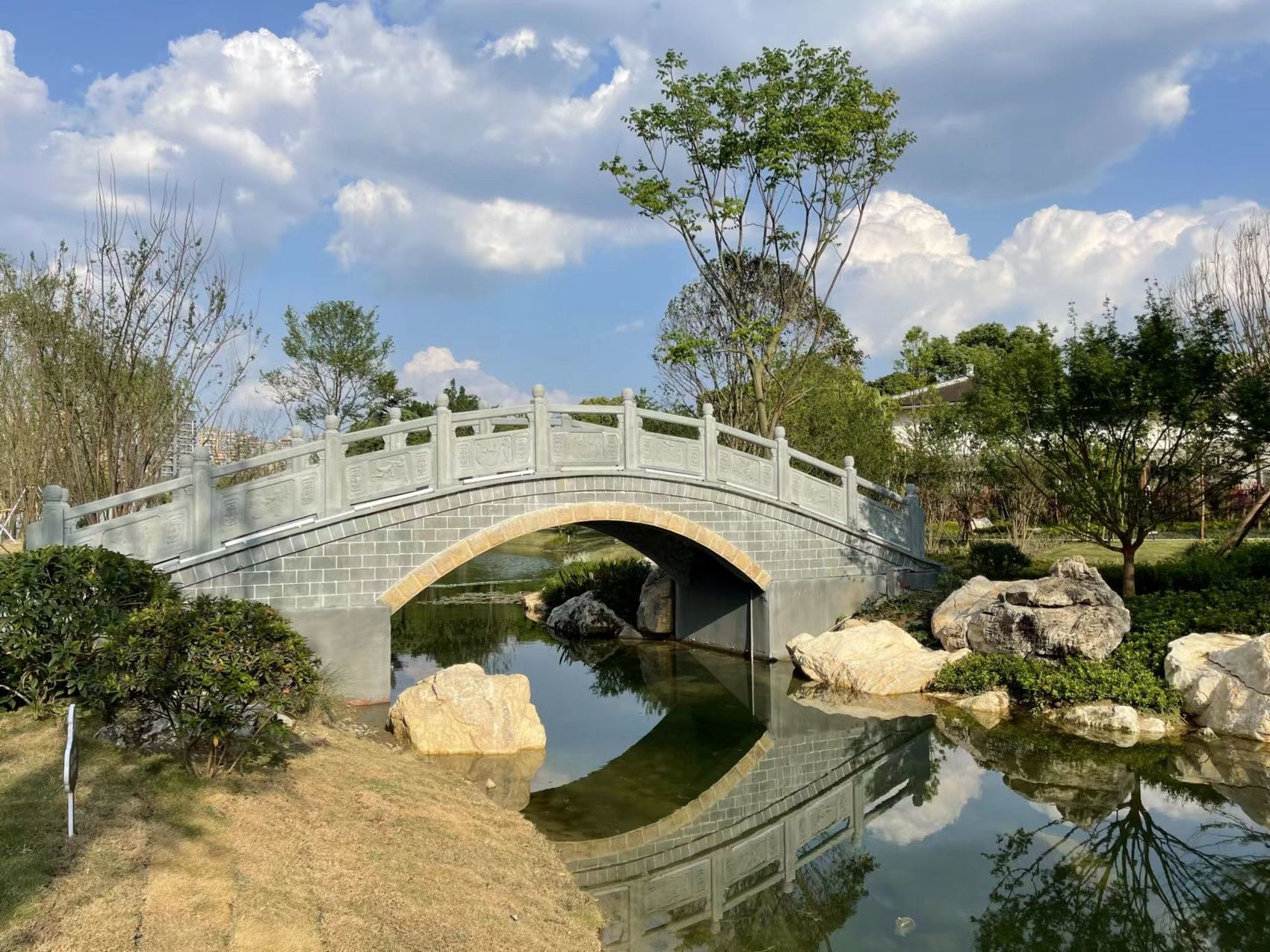 漫步在蜀园,小桥流水中式戏台尽显雅致,园林景观葱葱郁郁,石桥上雕刻着经典川剧折子戏中的经典场景,就算是公用厕所也是自然地掩映在假山曲径通幽处。