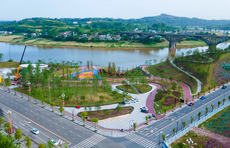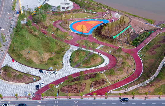 公园总体设计以3.5万平方米的公园绿地和8.4万平方米的河堤绿地为生态基底对公园景观进行打造,并实施沿江生态修复,让人一入公园就能看到大片的草坪绿植和宽敞的彩色步道。