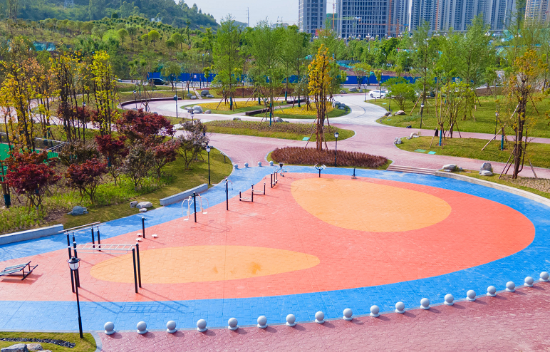 记者看到,公园里还设置有活动广场,地面色彩艳丽,云梯、双杠等健身器材一应俱全,满足市民健身需求。