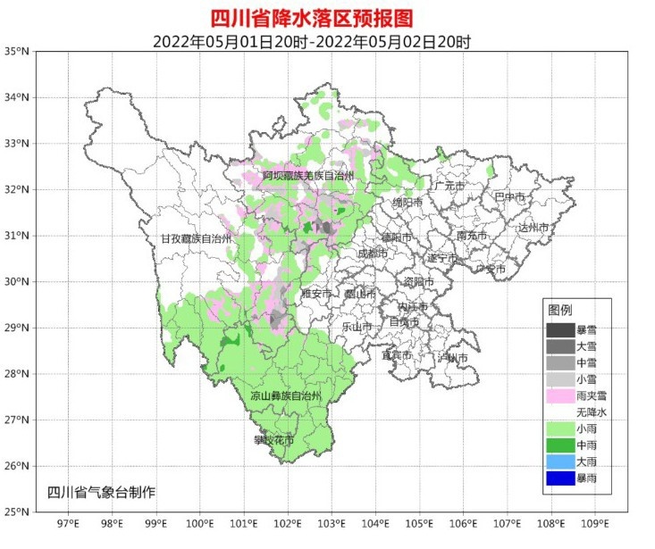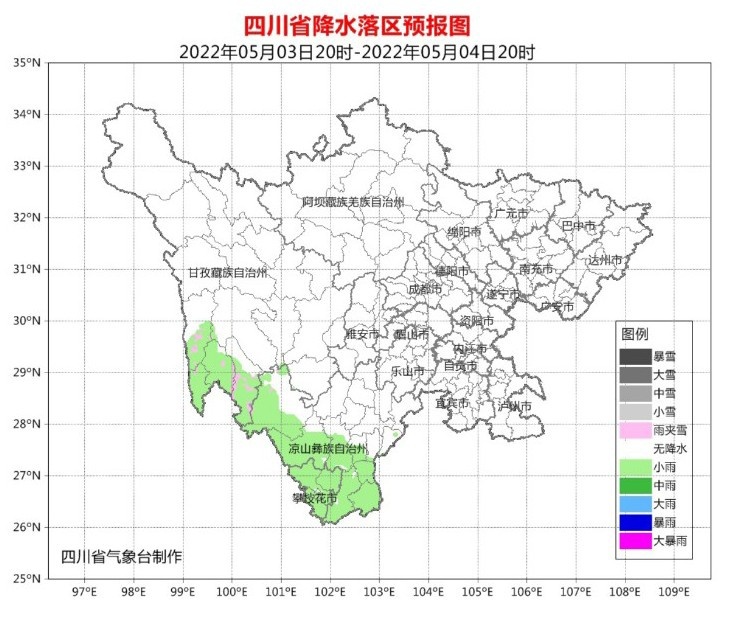5月2日晚上到3日白天,盆地各市多云间晴;川西高原大部晴间多云,其中甘孜州南部阴天间多云有阵雨(雪),局地中雨;攀西地区大部阴天有小雨,西北部局地中雨。