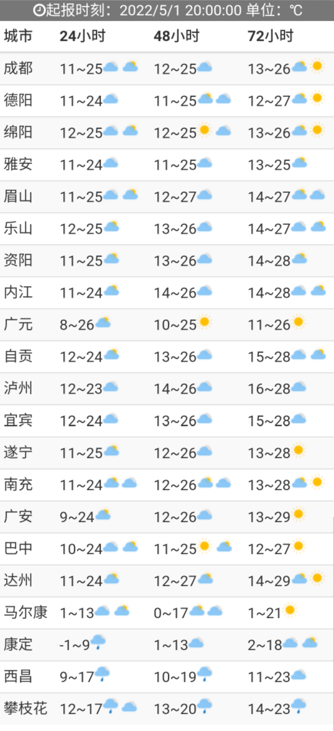 四川地级市72小时天气预报