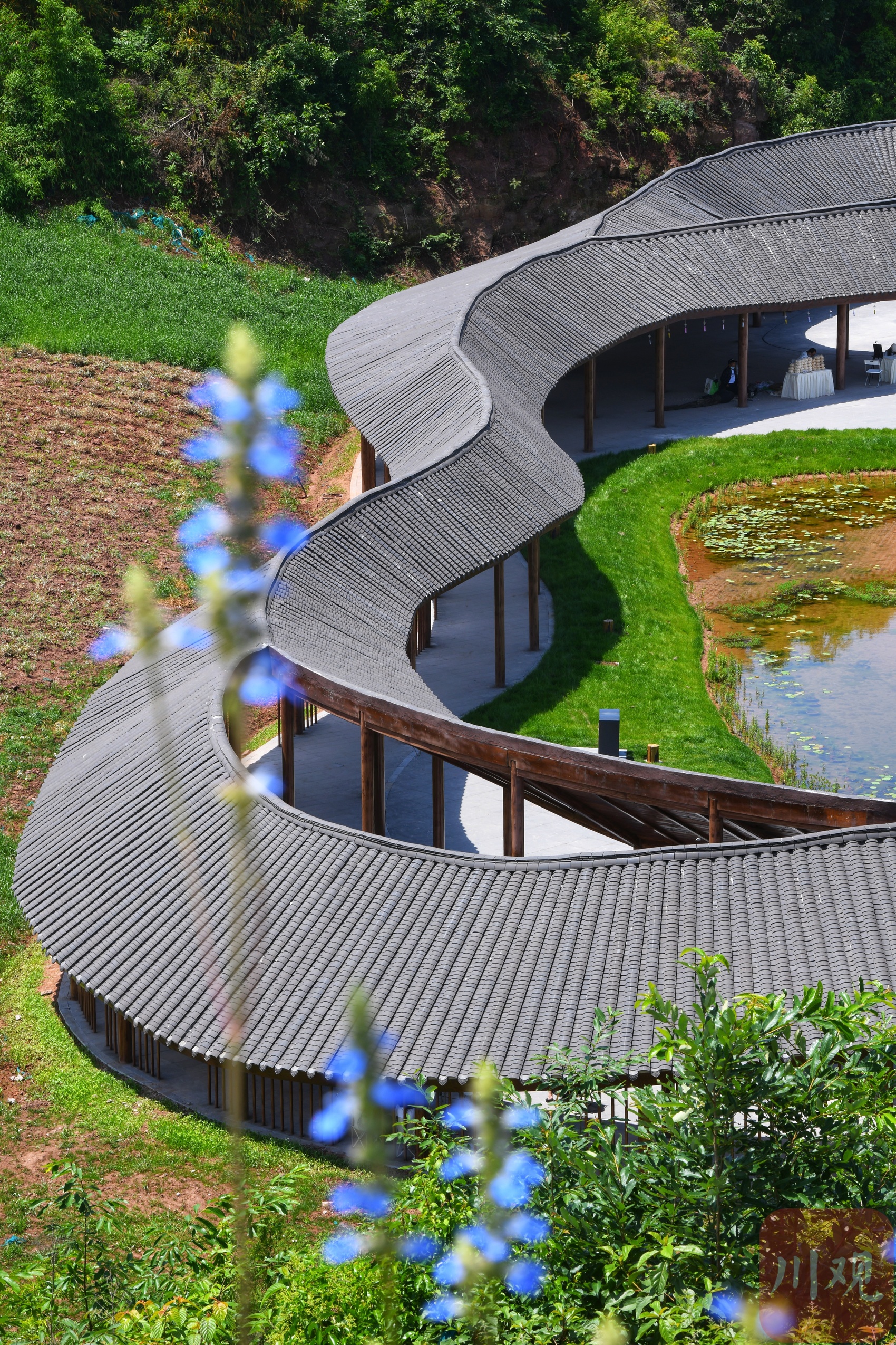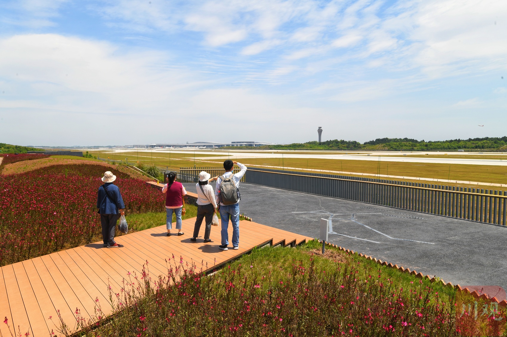 “三鱼萌狮文化村”景点内设有观景台,距成都天府国际机场西跑道仅数十米,可清晰观看飞机起降。西跑道是天府国际机场最长、等级最高的跑道,可容世界上最大的A380飞机起降。