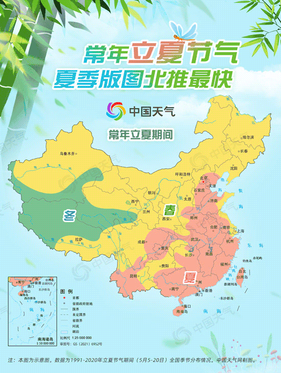 常年立夏节气期间,全国夏季版图开始迅速北推,且速度是最快的。夏天的脚步从华南、江南中部等地一路北扩,越过长江、江汉平原等地,最北能抵达华北中部地区,长沙(5月11日)、武汉(5月12日)、郑州(5月17日)、济南(5月17日)、石家庄(5月17日)、合肥(5月18日)、天津(5月18日)、南京(5月19日)等城市常年均在立夏节气期间入夏。