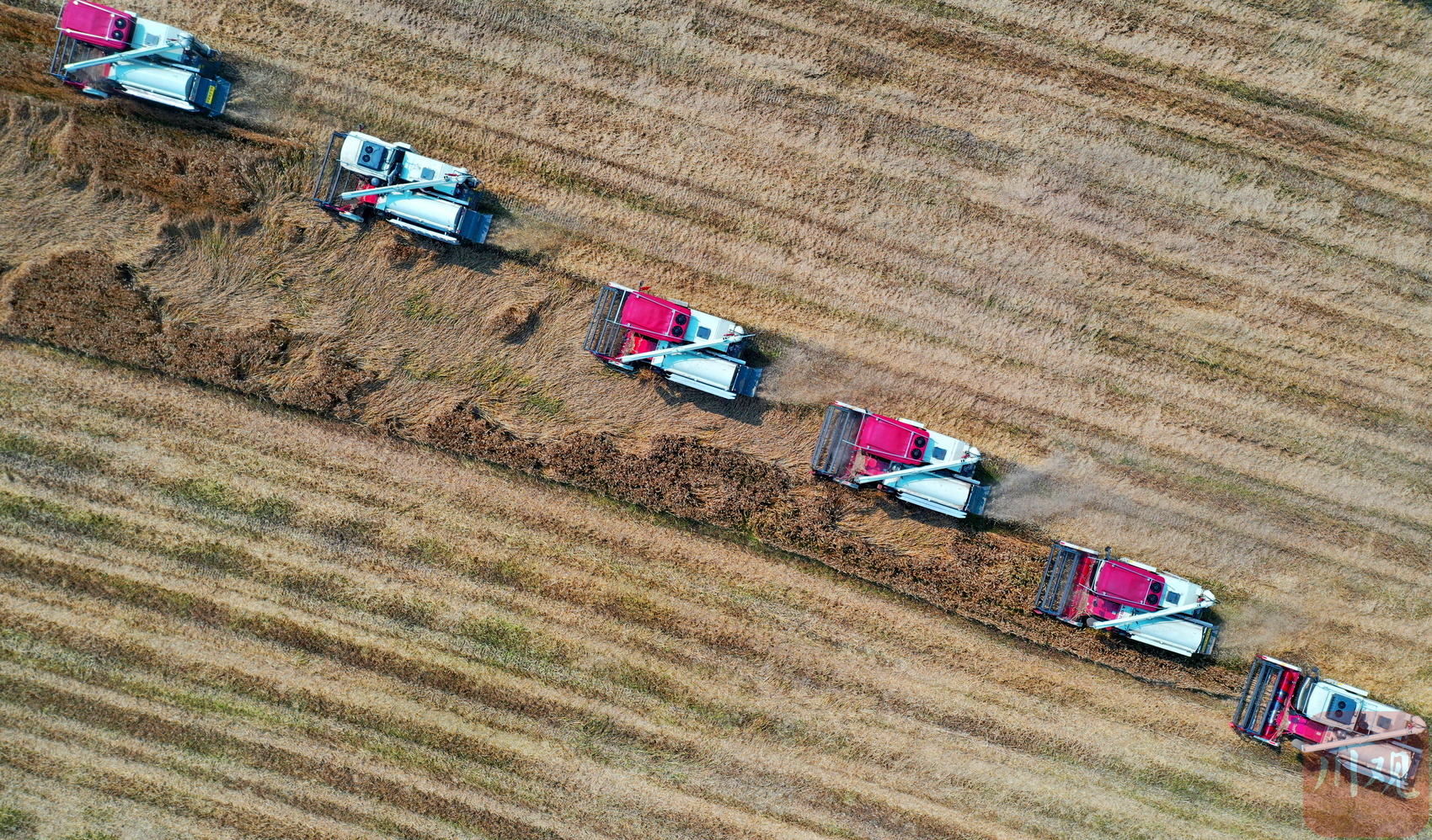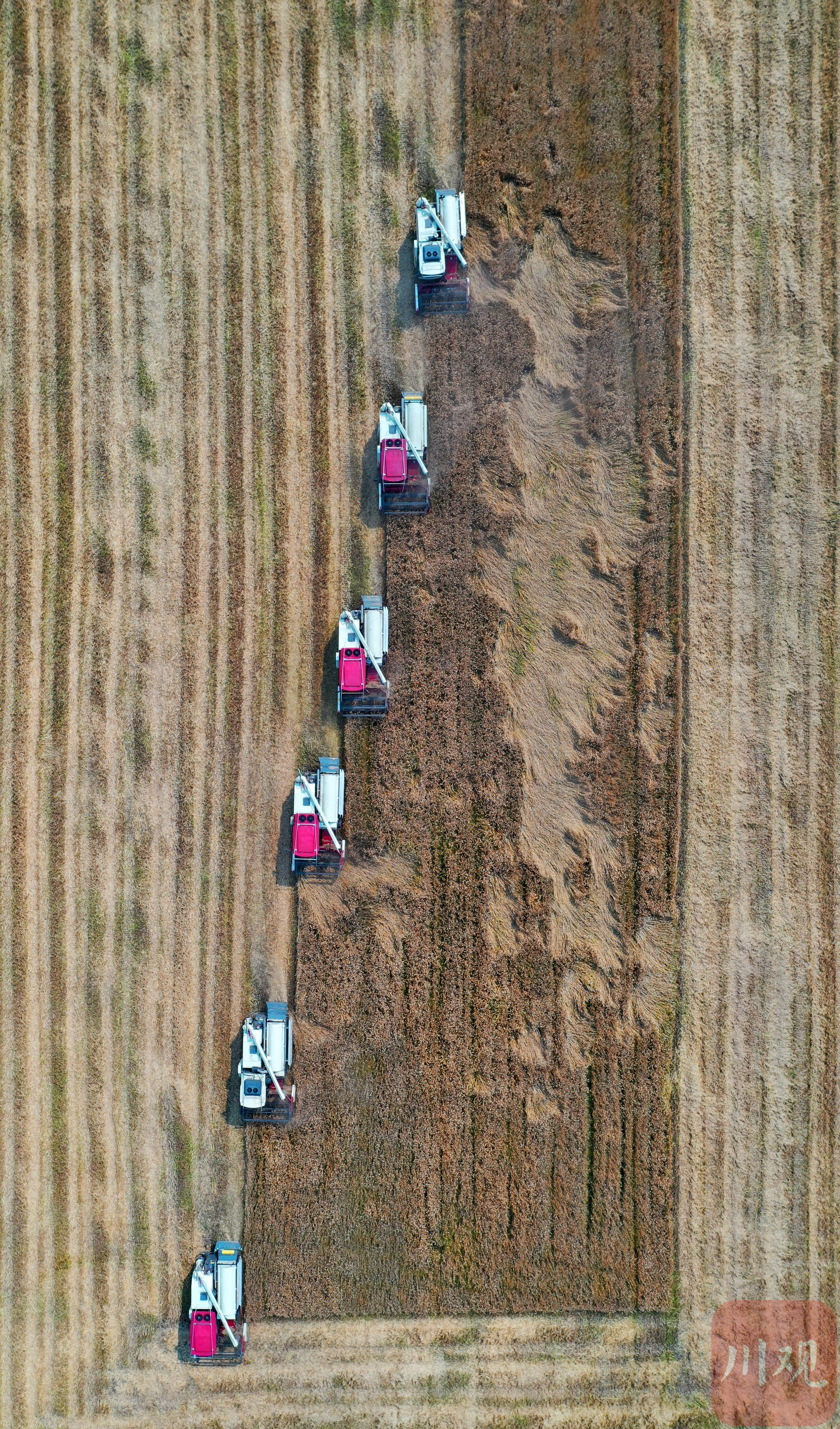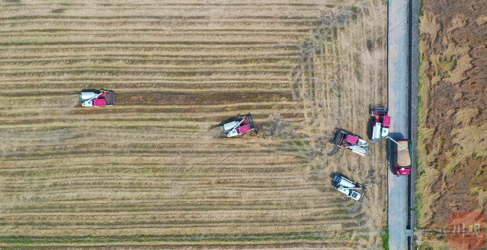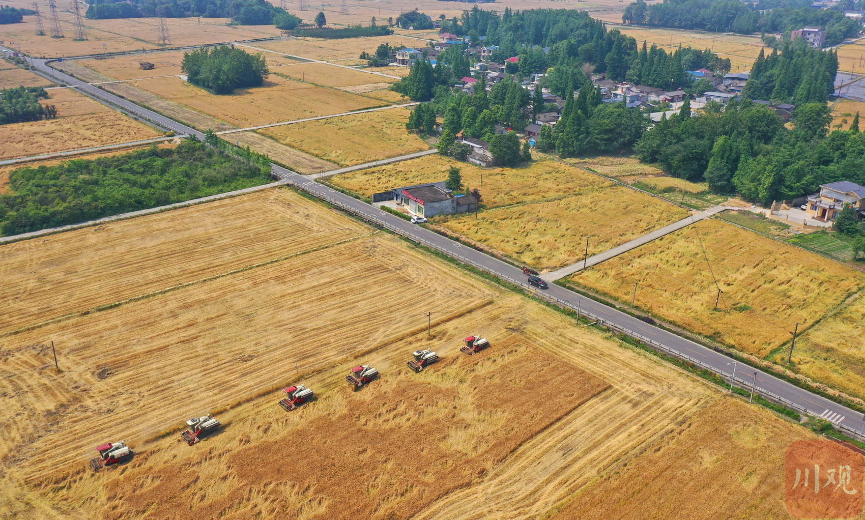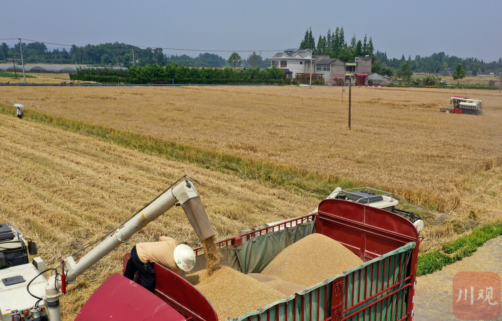 在崇州市道明镇新华村,收割机在麦浪里来回穿梭收割小麦。