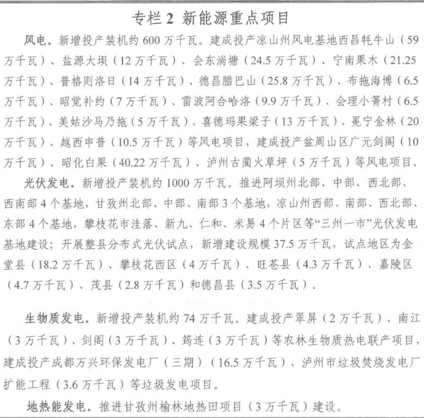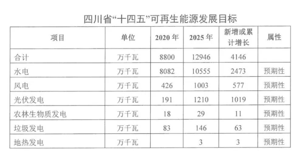 《规划》提出,“十四五”期间,四川省新增水电装机约2400万千瓦,风电约600万千瓦,光伏发电约1000万千瓦;至2025年底,水电装机突破1亿千瓦,风电突破1000万千瓦,光伏约1200万千瓦。
