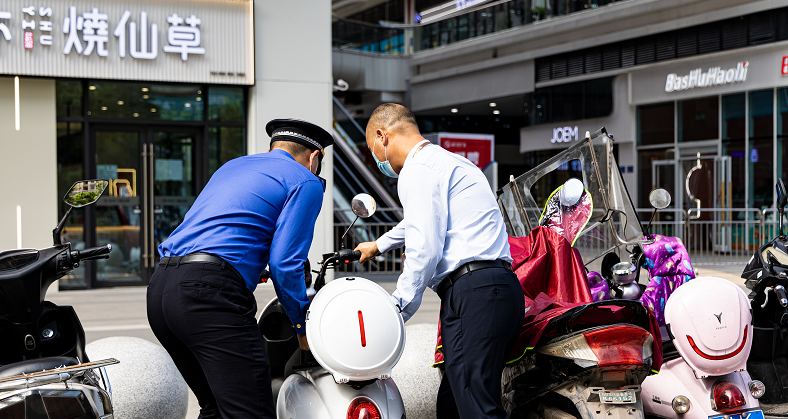5月初,内江隆昌市首个大型商业综合体——金沙·时代广场迎来开业后的第一个“五一”假期。牟振宇一边落实重点场所常态化疫情防控措施,一边应对小长假带来的小高峰,十分忙碌。为了让市民有个更好的“游购娱”环境,他和王洋一起,或整理摆放不规范的电瓶车,或指导正在装修的商户规范清运建筑垃圾。