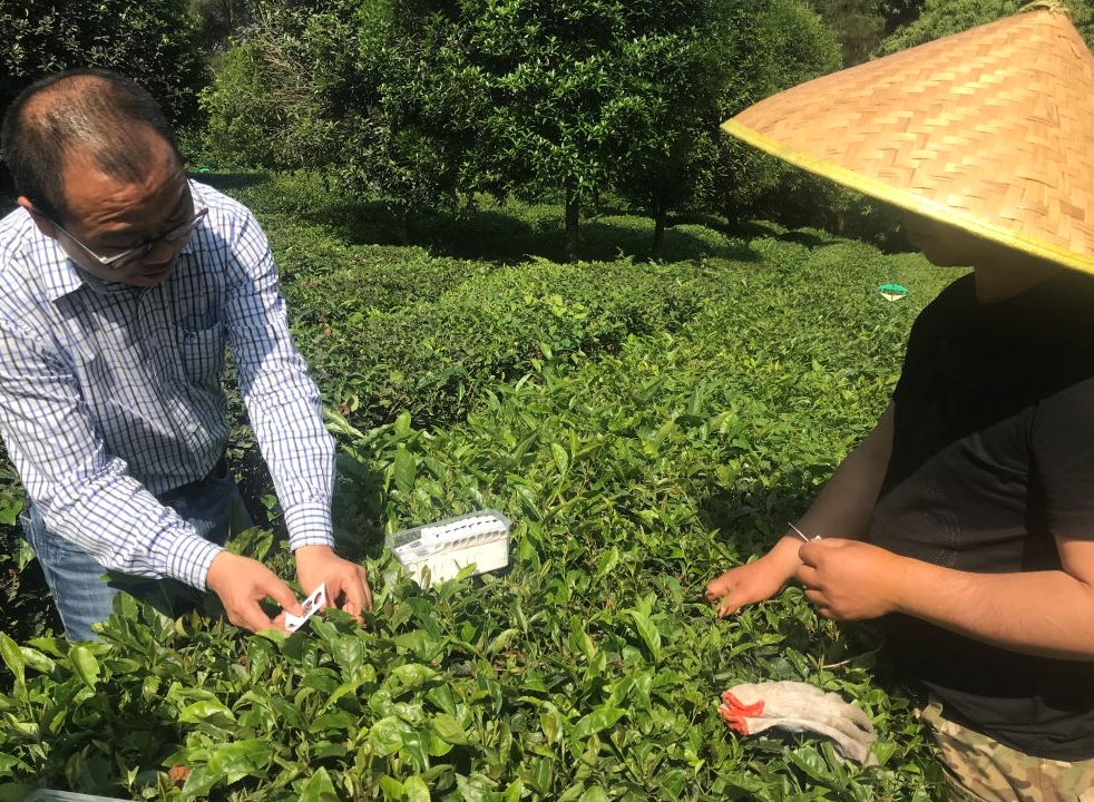 蒲德强(左)在指导茶园管理人员悬挂“卡片”。