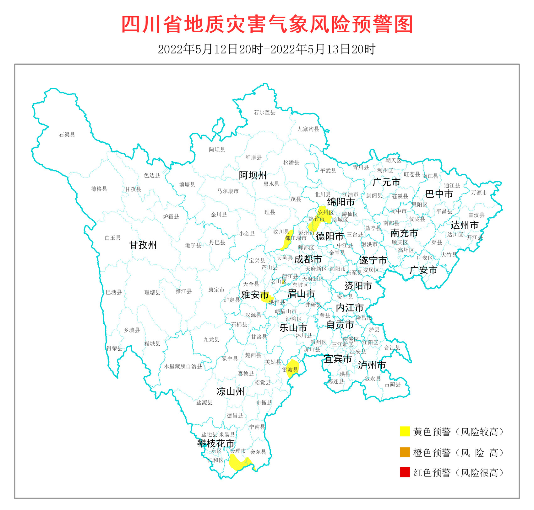 5月12日17时,四川省地质灾害指挥部办公室发布地质灾害气象风险3级黄色预警,涉及5市(州)12个县(市、区)。