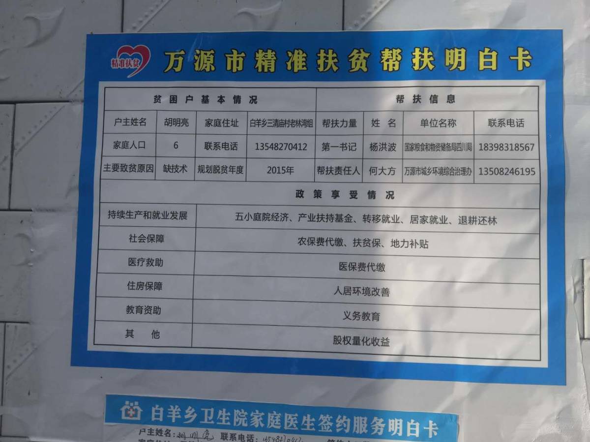 三清庙村村民胡明亮家的精准帮扶明白卡(樊邦平摄影)