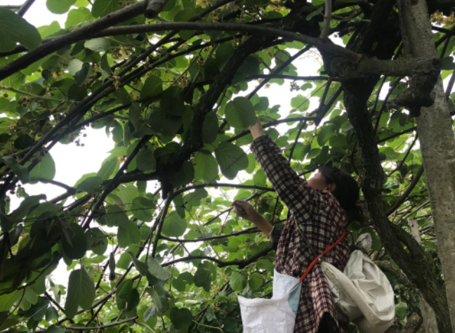 5月7日,在都江堰市向峨乡山上的一片猕猴桃园,一些农户正在为业主采摘雄花,一袋袋雄花一一过磅,农户可挣4.5元/斤的工钱,1个农户按一天采摘50至80斤计算,就可挣两三百元的工钱。