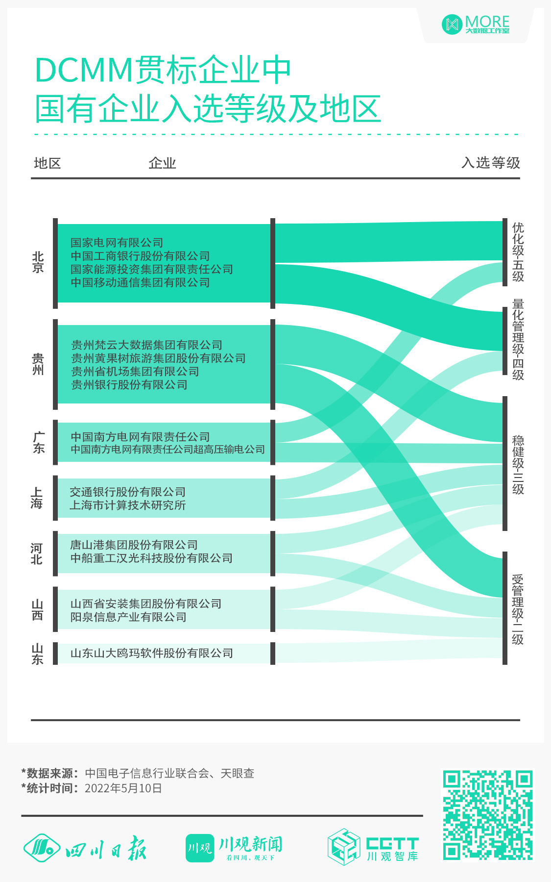 231家DCMM贯标企业中,国有企业共计17家,主要聚集在北京、贵州、广东、上海、河北、山西和山东,遍布电力、通讯、能源、金融、IT等领域。能源和金融领域的企业较多,分别有4家和3家。其中,国家电网有限公司、中国工商银行股份有限公司和中国南方电网有限责任公司是目前仅有的3家优化级企业,数据管理能力较强。