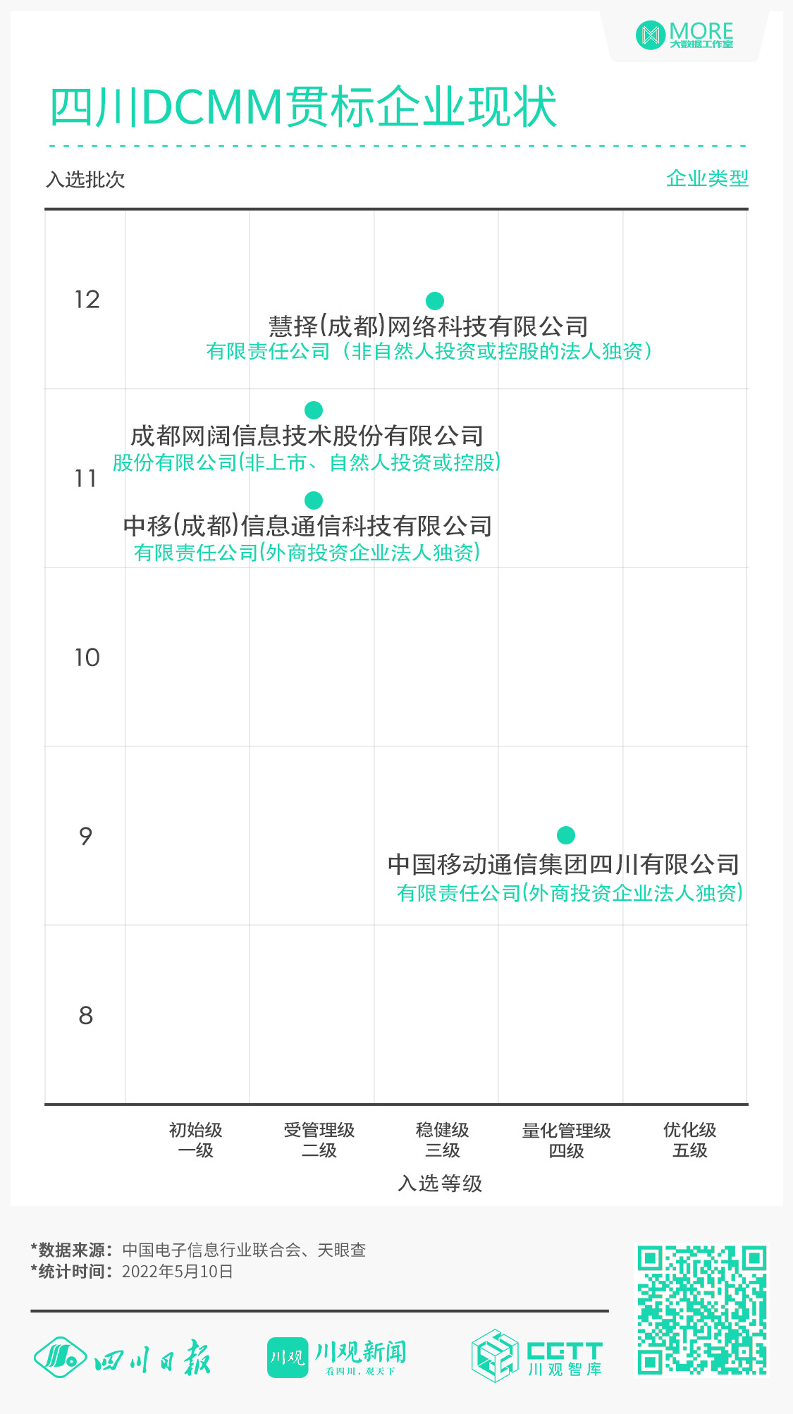 截至目前,四川有4家DCMM贯标企业。中国移动通信集团四川有限公司在2021年12月获得量化管理级认证,是成都最早获批同时也是获批等级最高的企业。4家企业中,有2家企业类型是有限责任公司(外商投资法人独资),暂无国有企业。